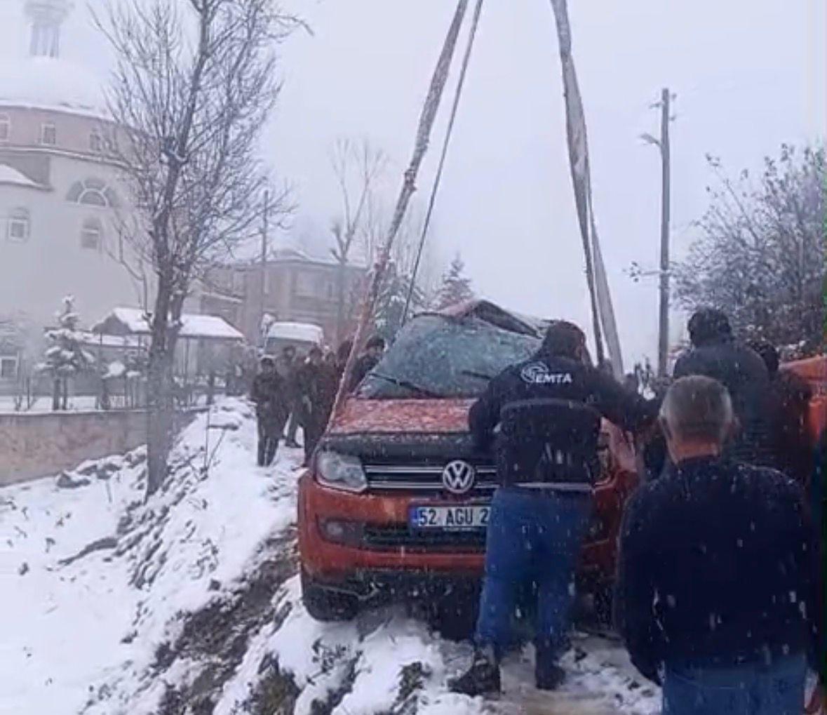 Kaza, saat 12.30 sıralarında Bayıralan Mahallesi’nde meydana geldi. İlker Göl (36) yönetimindeki 52 AGU 294 plakalı kamyonet, karla kaplı yolda karşı yönden gelen bir araca yol vermek amacıyla manevra yaptığı sırada sürücüsünün kontrolünden çıkarak, şarampole yuvarlandı.