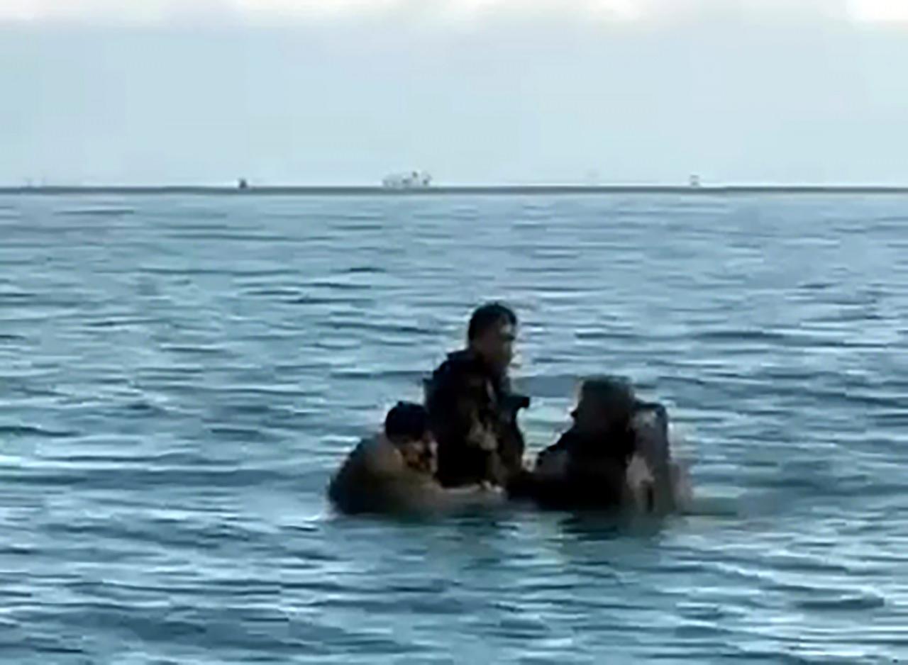 Balıkçıların kıyıya götürdüğü 3 kişi, çağrılan ambulansla tedbir amaçlı hastaneye kaldırıldı. O anlar balıkçılar tarafından cep telefonuyla kaydedildi.