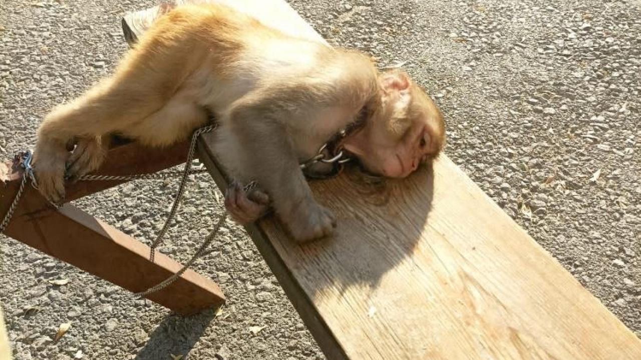 Adana Çukurova'da bir bankın üzerine uzanan makak cinsi maymun bulundu.