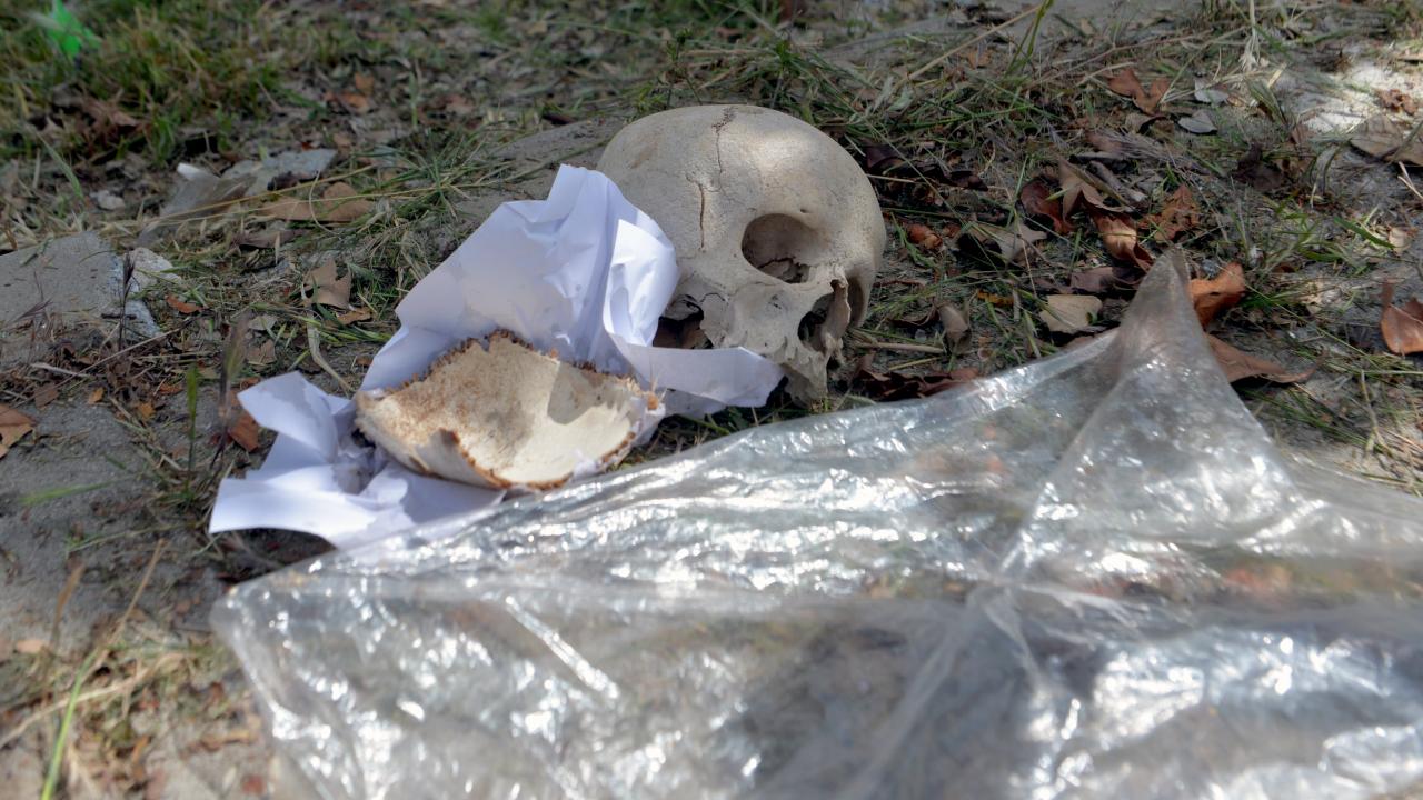Mahallesindeki küçükbaş hayvanları beslemek için çöpte bayat ekmek arayan Kaplan, poşetlerden birinde kağıda sarılı insan kafatası buldu.