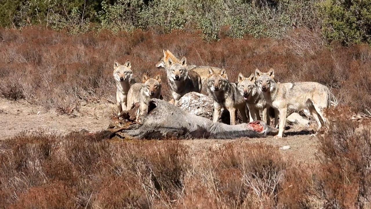 Afyonkarahisar Sandıklı'da bulunan Akdağ Tabiat Parkı'nda kurt sürüsü, avladıkları yılkı atı ile beslenirken görüntülendi.