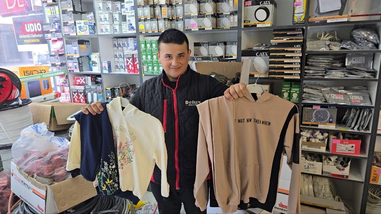 Amasya'nın Suluova ilçesinde elektrikçi çırağı olarak çalışan Emir Baran Gökteniz (17), elde ettiği kazançla tamir için gittiği evlerde çocuklara kıyafet hediye ediyor.