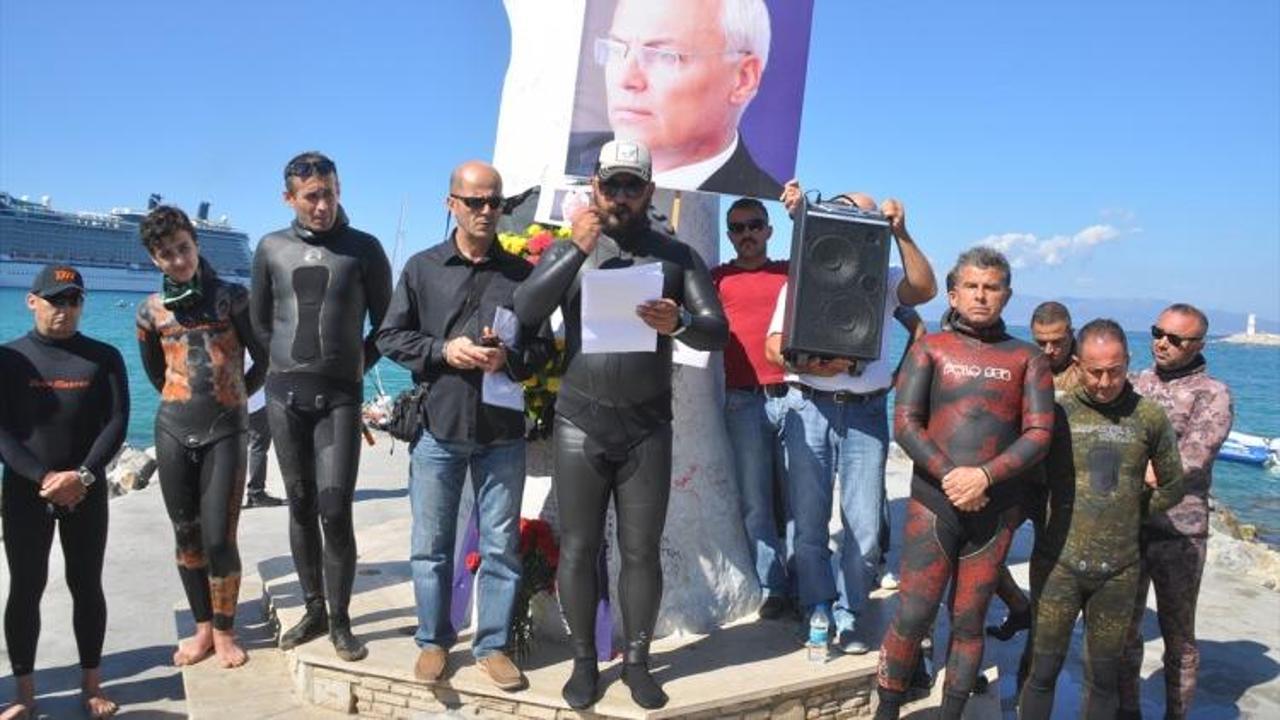Kuşadası ilçesinde zıpkınla balık avlamak için girdiği denizde teknenin çarpması sonucu hayatını kaybeden öğretmenin meslektaşları ve yakınları, denize karanfil bıraktı.
