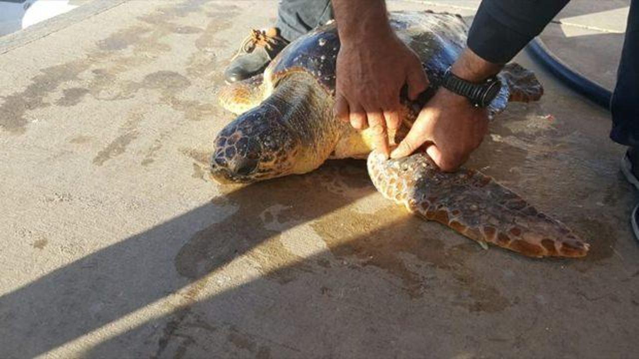 Aydın'ın Didim ilçesinde ayaklarına misina dolanan caretta caretta cinsi kaplumbağa Sahil Güvenlik Komutanlığı ekiplerince kurtarıldı.