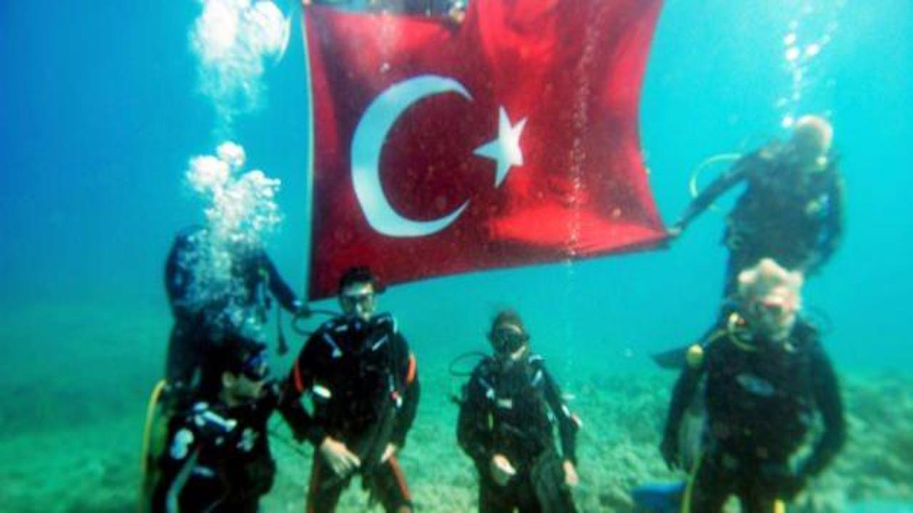 Dalış okulunun eğitmeni Kemal Çalışkan öncülüğünde Ege Denizi'ne giren dalgıçlar, yaklaşık 6 metrekarelik Türk bayrağı açtıktan sonra bir dakikalık saygı duruşunda bulundu.