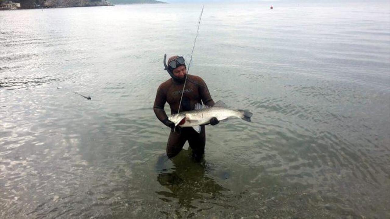Erdek ilçesinde bir kişi, zıpkınla 15 kilogram ağırlığında levrek avladı.