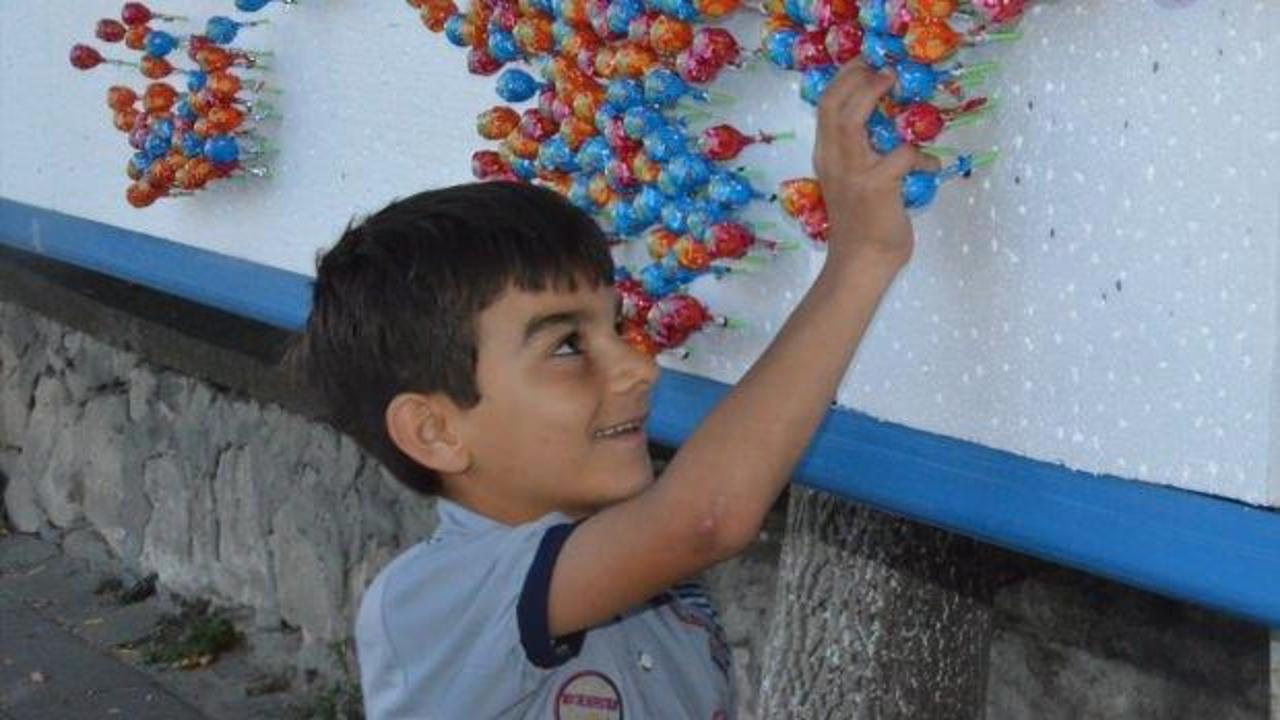Minikler üzeri şeker dolu reklam panolarından şekerlerini alırken kentte renkli görüntüler ortaya çıktı.