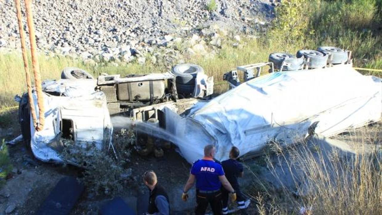 Bilecik'in Osmaneli ilçesinde devrilen çimento yüklü tırın şoförü hayatını kaybetti.