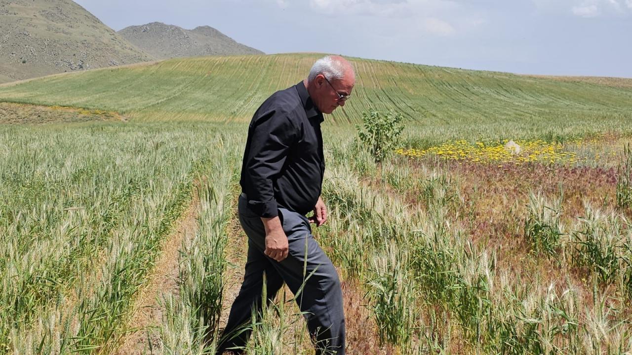 "Burası Adilcevaz sınırları içerisinde bulunan 2600 rakımlı Uzunsırt Yaylası. 250 dönüm buğday tarlasına 15 gün önce gelip baktığımda muhteşem görünüyordu. Bugün ise gelip baktım maalesef tüm emeğimiz yok olmuş. Kuru soğuk ve fırtına buğday başaklarını kurutmuş. Boş bir başakla karşı karşıyayız. Allah hiç kimsenin emeğini boşa çıkartmasın."