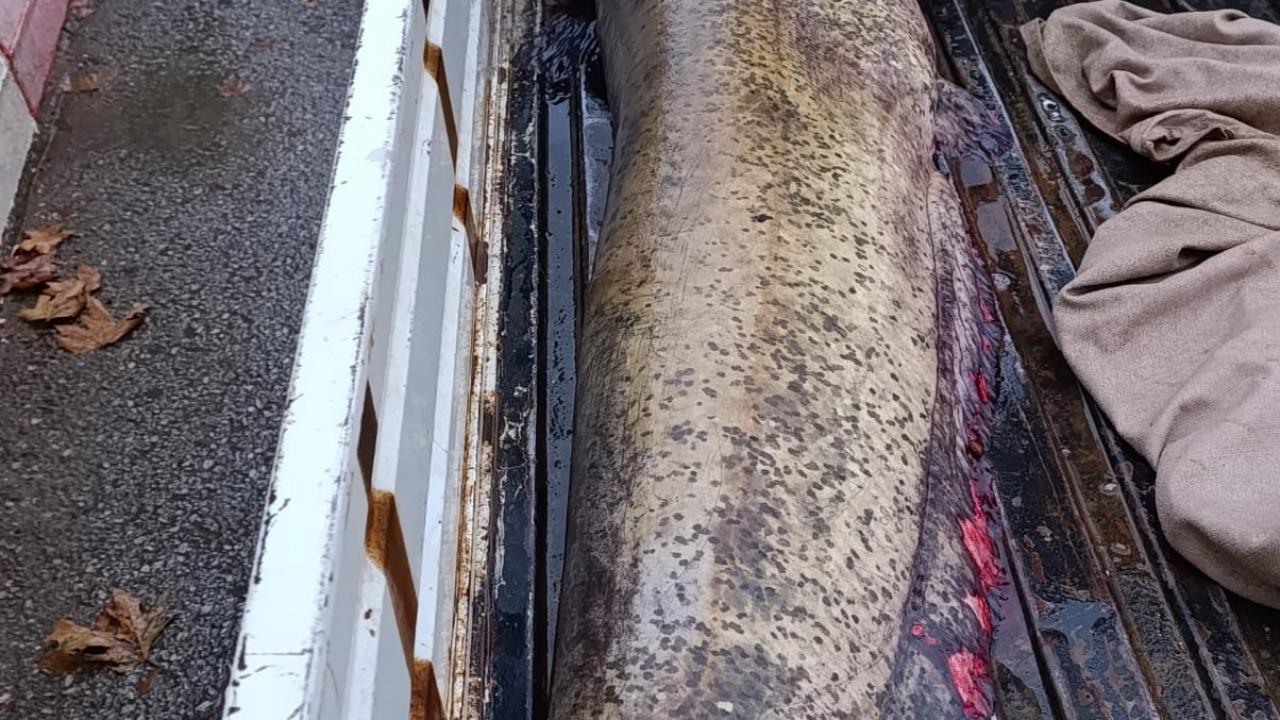 Dev yayın balığı daha sonra 4 kişi tarafından güçlükle araca yüklenebildi.
