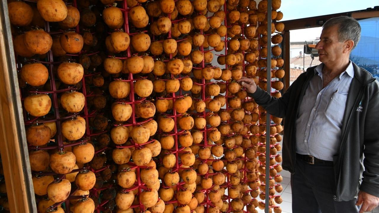 Çanakkale'nin Lapseki ilçesinde üretici Sabri Özkan, bahçesinde yetiştirdiği Trabzon hurmalarını kendi tasarladığı aletle kurutup kilogramını 500 TL'den satıyor.
