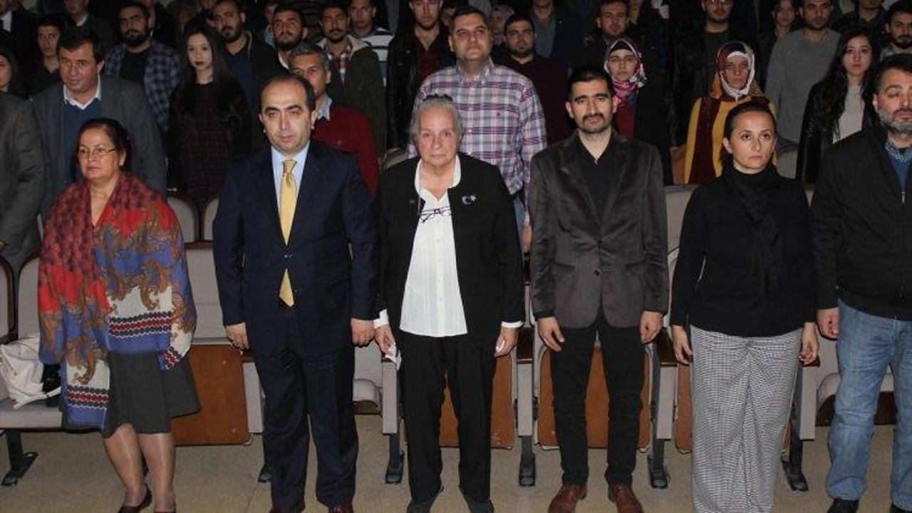 ABONE OLYıldıran, Çankırı Karatekin Üniversitesi öğrencileri tarafından 100. Yıl Kültür Merkezi'nde düzenlenen Cumhuriyetin Kuruluşu Konferansı'ndaki sunumuna, babasına ait fotoğrafları göstererek başladı.