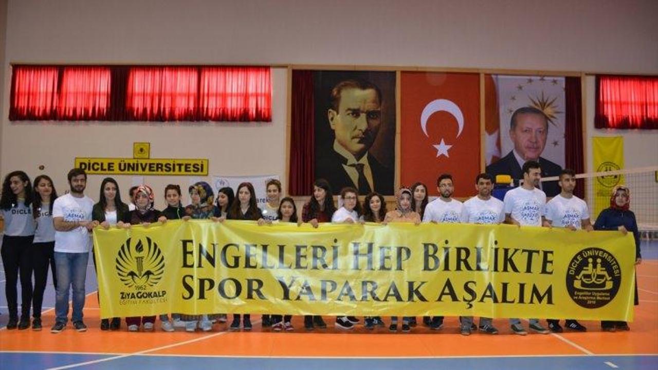 ABONE OLDicle Üniversitesi (DÜ) Spor Salonu'nda düzenlenen etkinlikte, üniversite öğrencileri, engelli arkadaşlarıyla halay çekti, basketbol ve voleybol oynadı.
