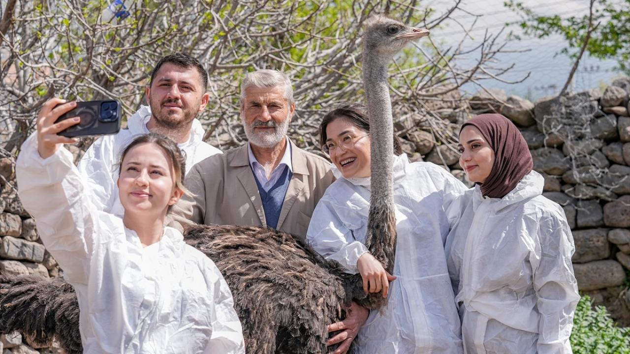 İlk kez bir deve kuşunu muayene etme imkanı bulan veteriner fakültesi öğrencileri "Hüdhüd" ile fotoğraf çektirdi.