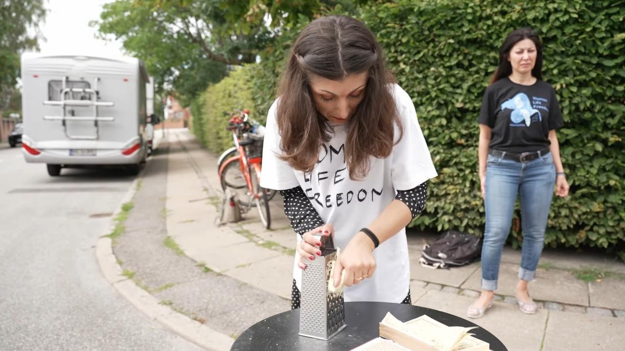 İran'dan Danimarka'ya kaçan Firoozeh Bazrafkan isimli kadın, başkent Kopenhag'daki İran Büyükelçiliği önünde "Kadınlara özgürlük" yazılı tişörtüyle Kur'an-ı Kerim'i yırttıktan sonra rendeden geçirdi.