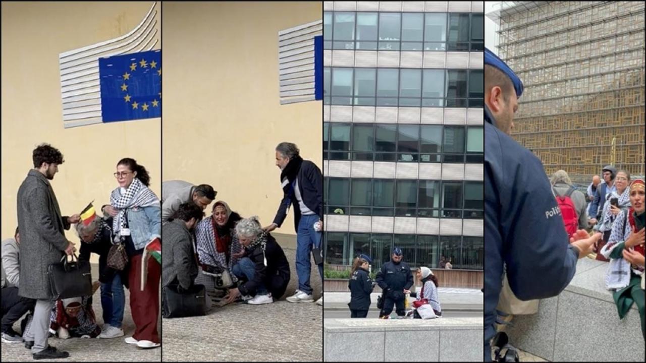 AB Komisyonunun giriş kapısında Gazze için ağıt yakan Filistin destekçisi genç bir kadın, AB'nin sessizliğine ve suç ortaklığına dayanamadığını söyleyerek yere yığıldı.