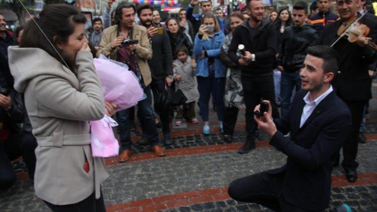 Bağcık'ın diz çökerek uzattığı yüzükle yaptığı evlilik teklifine Erkan'ın "Evet" yanıtı sonrası çiftin arkadaşları da kalp şeklindeki kırmızı balonlarla birlikte "Seni çok seviyorum, benimle evlenir misin güzelim?" yazılı pankart açtı.
