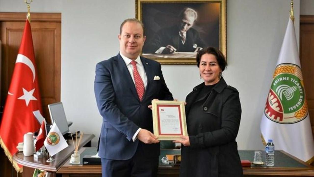 Edirne Sosyal Yardımlaşma ve Dayanışma Vakfı Müdürü Hicran Balı, Edirne Ticaret Borsası (ETB) Başkanı Özay Öztürk'ü ziyaret ederek, vakfa verdiği desteklerden dolayı teşekkür belgesi verdi.