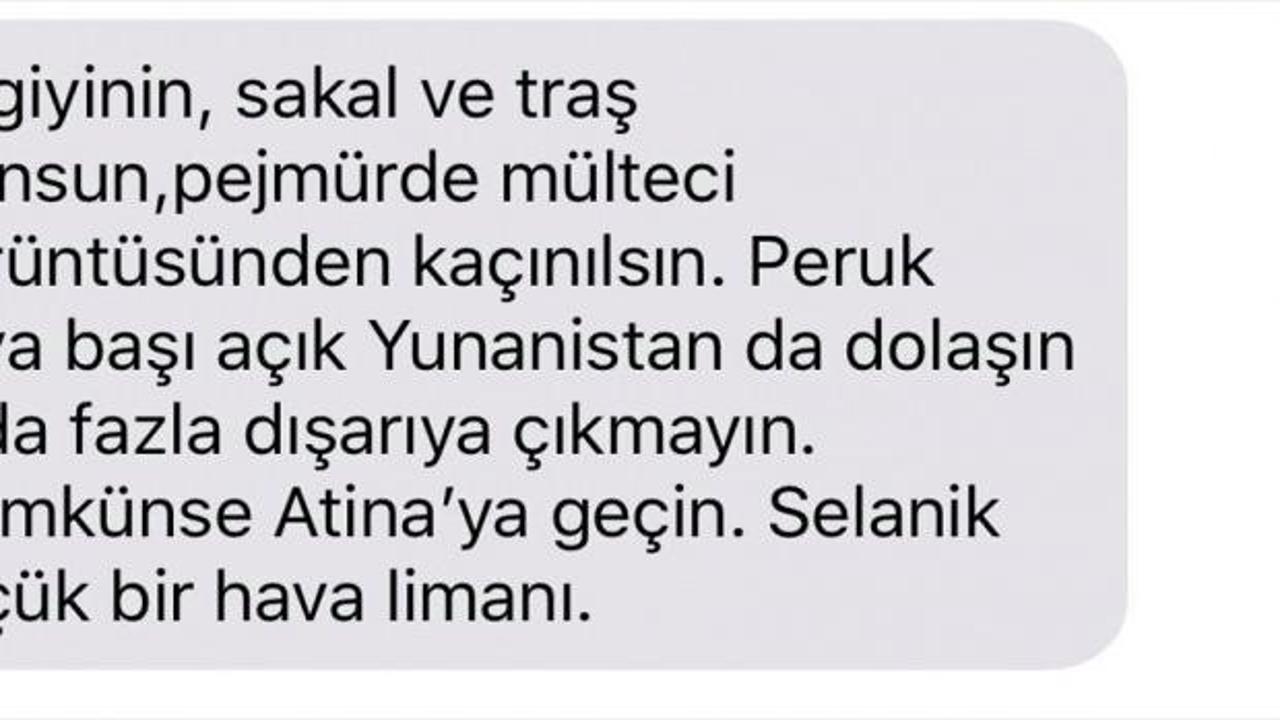 Gönderilen mesajda "İyi giyinin, sakal tıraşı olun, mülteci görüntüsünden kaçının. Peruklu veya başı açık Yunanistan'da dolaşın ya da fazla dışarı çıkmayın. Mümkünse Atina'ya geçin. Selanik küçük bir havalimanı" talimatı yer aldı.