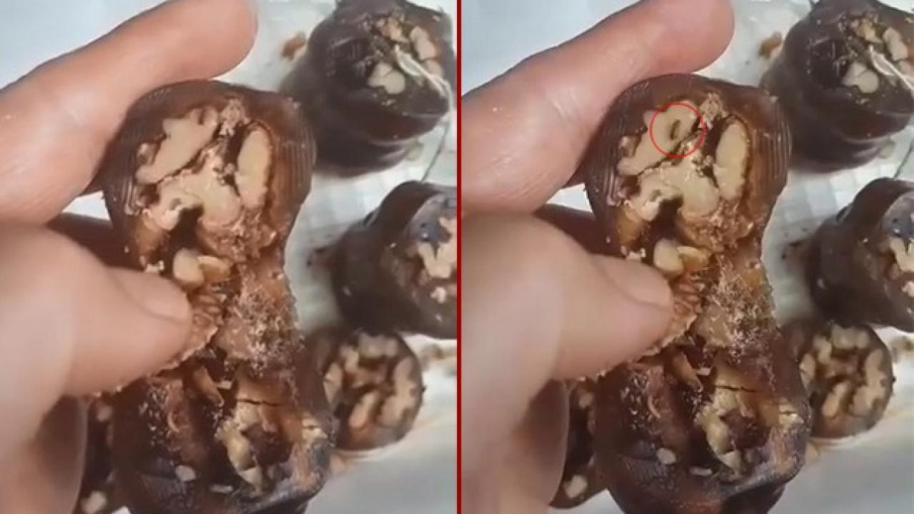 Elazığ'da bir vatandaş aldığı cevizli sucuğun (orcik) içinden böcek çıktığını iddia ederek, o anlar cep telefonu kamerası ile kaydetti.