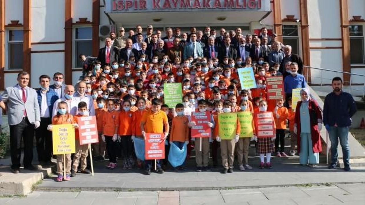 ABONE OLİspir Kaymakamlığı tarafından düzenlenen etkinlikte, ilçedeki tüm anaokulu ve ilkokullarda uygulanan "Çevre Duyarlılık Hareketi" kapsamında öğrenciler, hazırladıkları pankart ve dövizlerle vatandaşlara mesaj verdi.