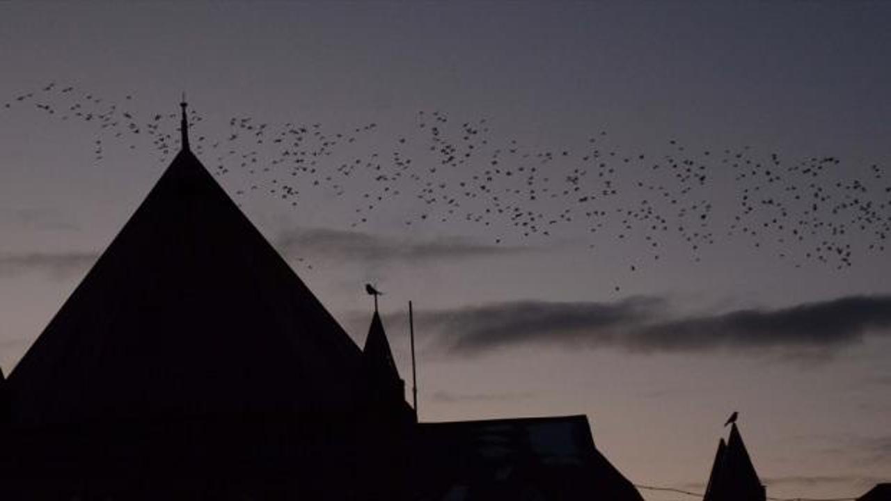 Kenti kaplayan sis üzerinde birbirleriyle uyumlu hareket eden kuşların gün batımı kızıllığında oluşturduğu görüntü izleyenleri büyüledi.