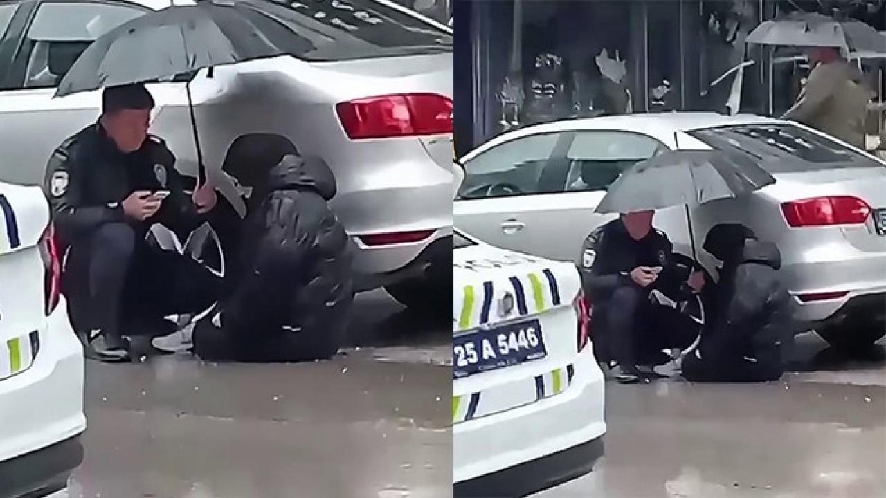 Erzurum’da meydana gelen kazada yaralanan 15 yaşındaki çocuğa bir polis, ambulans beklerken ıslanmaması için şemsiye tuttu. Telefon kamerasına yansıyan görüntü yürekleri ısıttı.