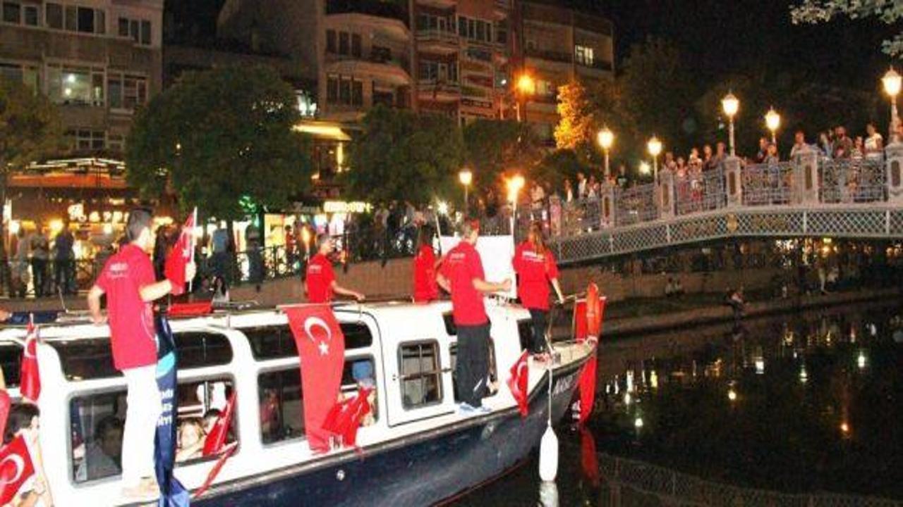 Sadece, Eskişehir Marşı'nın çalındığı teknelerde, gençler ''Şehitlerimizi minnetle anıyoruz'' yazılı pankartlar taşıdı.