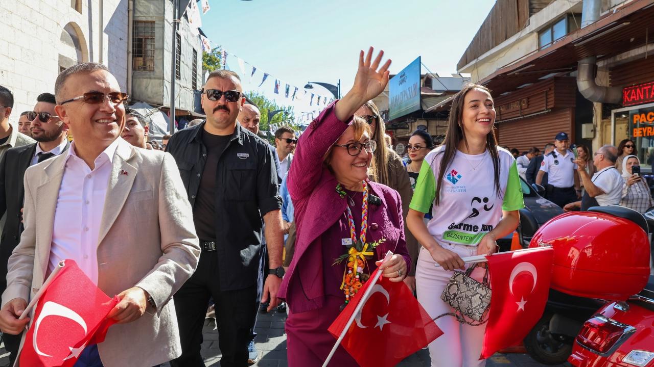 Gaziantep Kalesi’nde toplanan kalabalık, Büyükşehir Belediyesi Bandosu’nun çaldığı şarkılar eşliğinde şehrin tarihi noktalarından olan Bakırcılar Çarşısı ve Almacı Pazarı’ndan geçerek Balıklı Meydanı’na geldi.