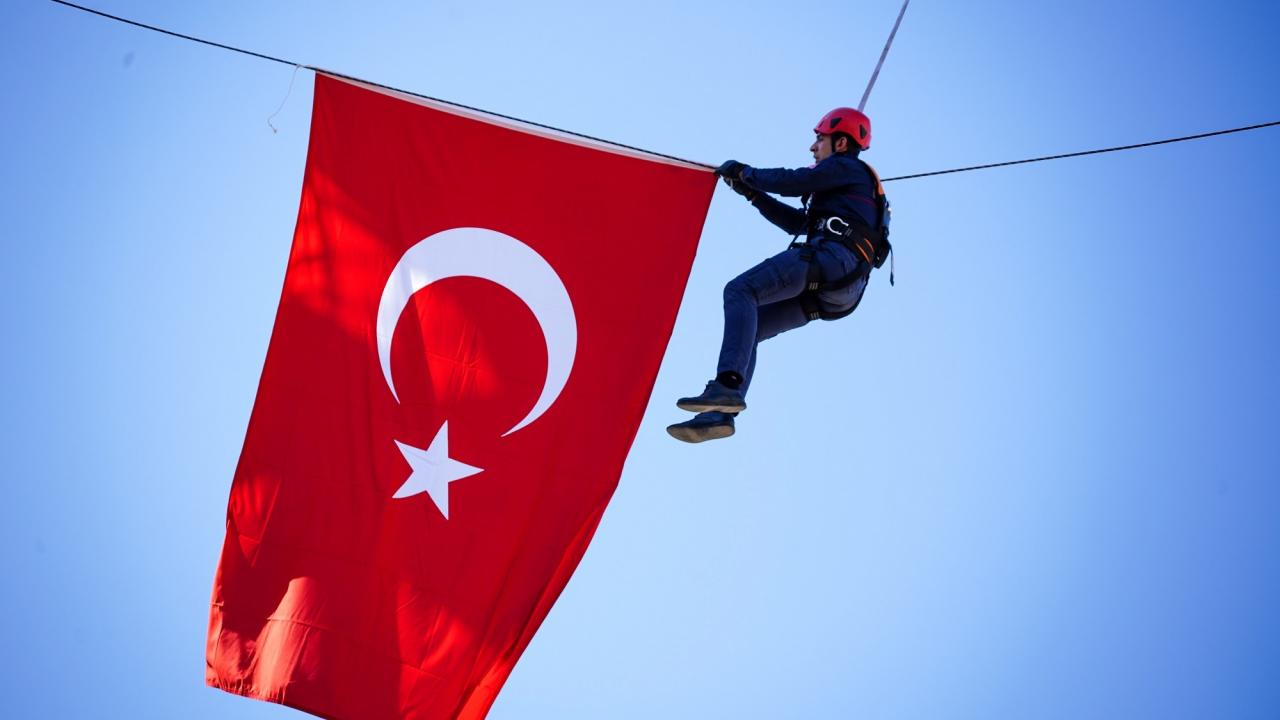 Gösterilerin ikinci bölümünde ise vinç yardımıyla yükseğe çıkan bir itfaiye personeli, Türk bayrağını ip düzenekle binanın cephesine asarak açtı.