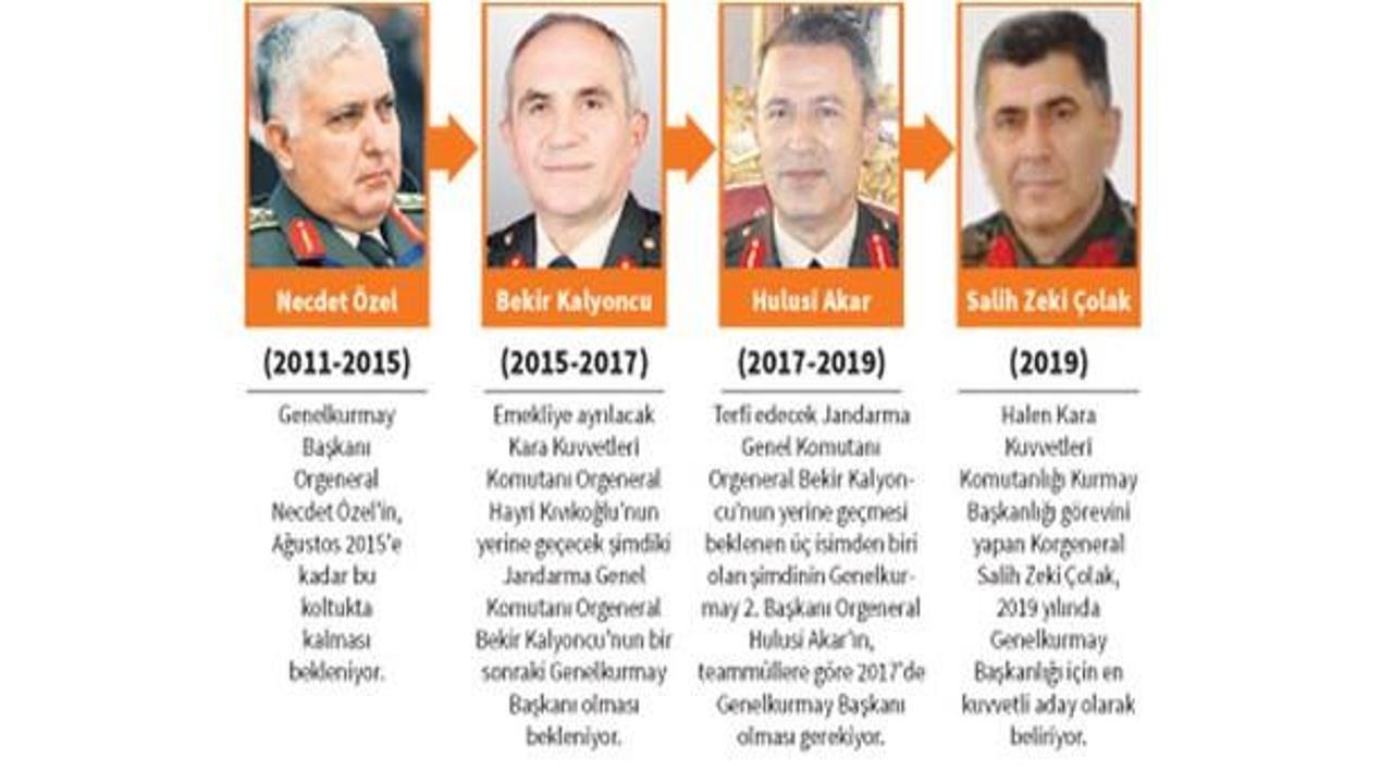 2017'de ise Jandarma Genel Komutanı olması beklenen Orgeneral Akar'ın Genelkurmay Başkanlığı koltuğuna oturması bekleniyor. Halen Kara Kuvvetleri Komutanlığı Kurmay Başkanlığı görevini yapan Korgeneral Salih Zeki Çolak, 2019'da Genelkurmay Başkanlığı için en kuvvetli aday olarak beliriyor.