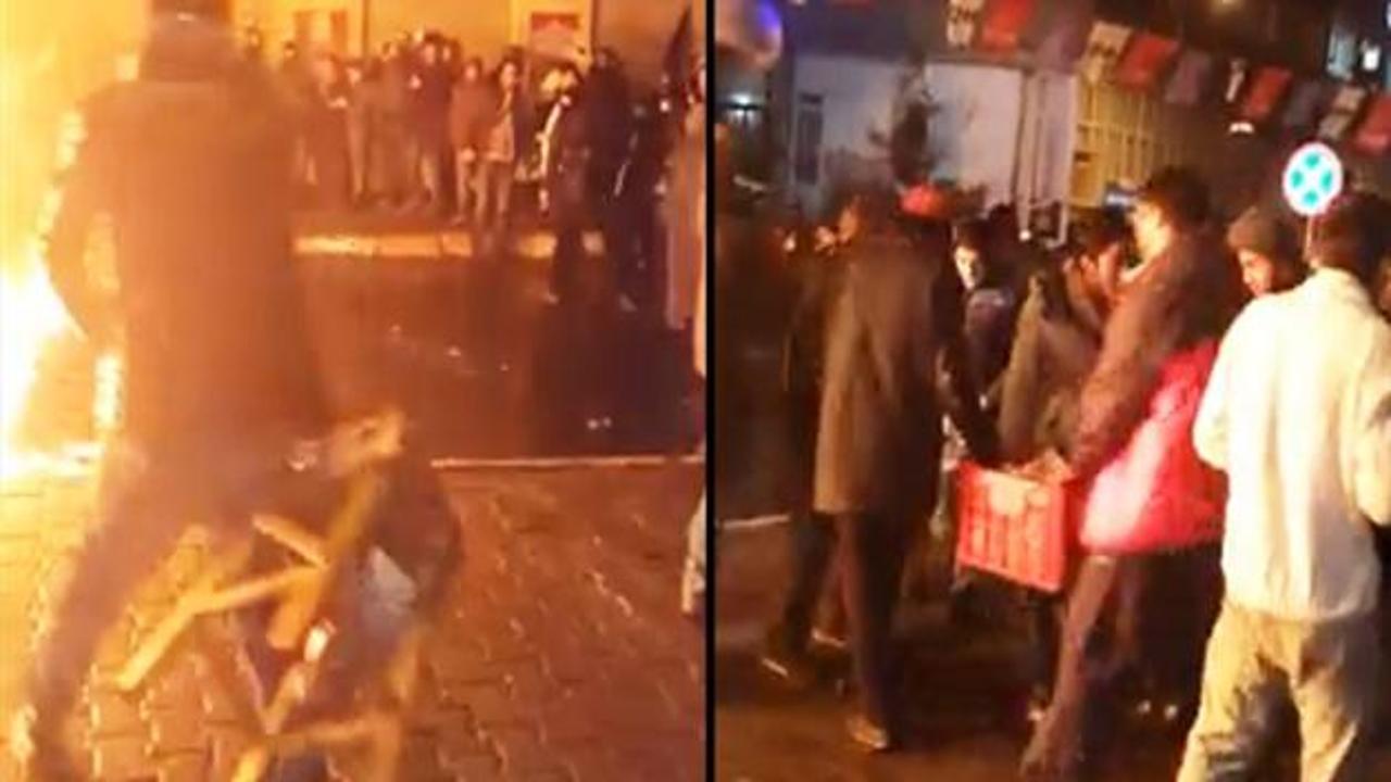 Yaşananları kamera kaydına alan şahıs sokak ortasında yaktıkları ateşin alevlerinin yükseldiğini ve yağmaladıkları eşyaları atmaması gerektiğini söylüyor. Aksi halde elektrik kablolarının ateş alacağını kendilerinin yanacağını ifade ediyor.