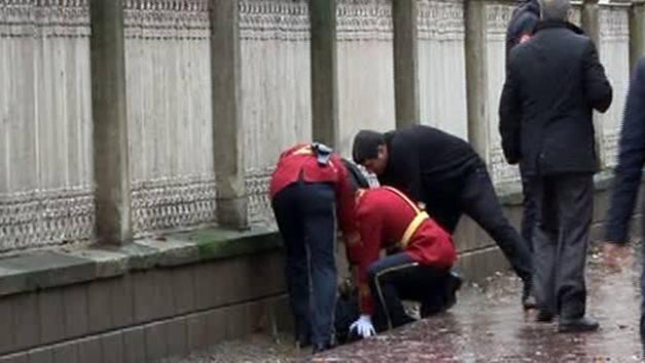 Kelepçelenen kişi saray içindeki polis noktasına götürülürken bomba imha uzmanlarının olay yerindeki incelemesi sürüyor.