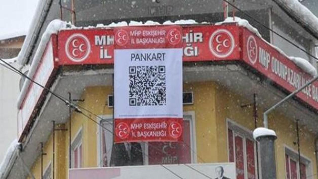 Eskişehir’de MHP il binasına, üzerinde ’Pankart’ yazısı altında da akıllı telefon aplikasyonları ile okunabilen karekodu olan ’Bu pankartta hiçbir şey yazmıyor ama siz yinede ne demek istediğimizi anlayabiliyorsunuz’ yazısının yer aldığı bir pankart asıldı.