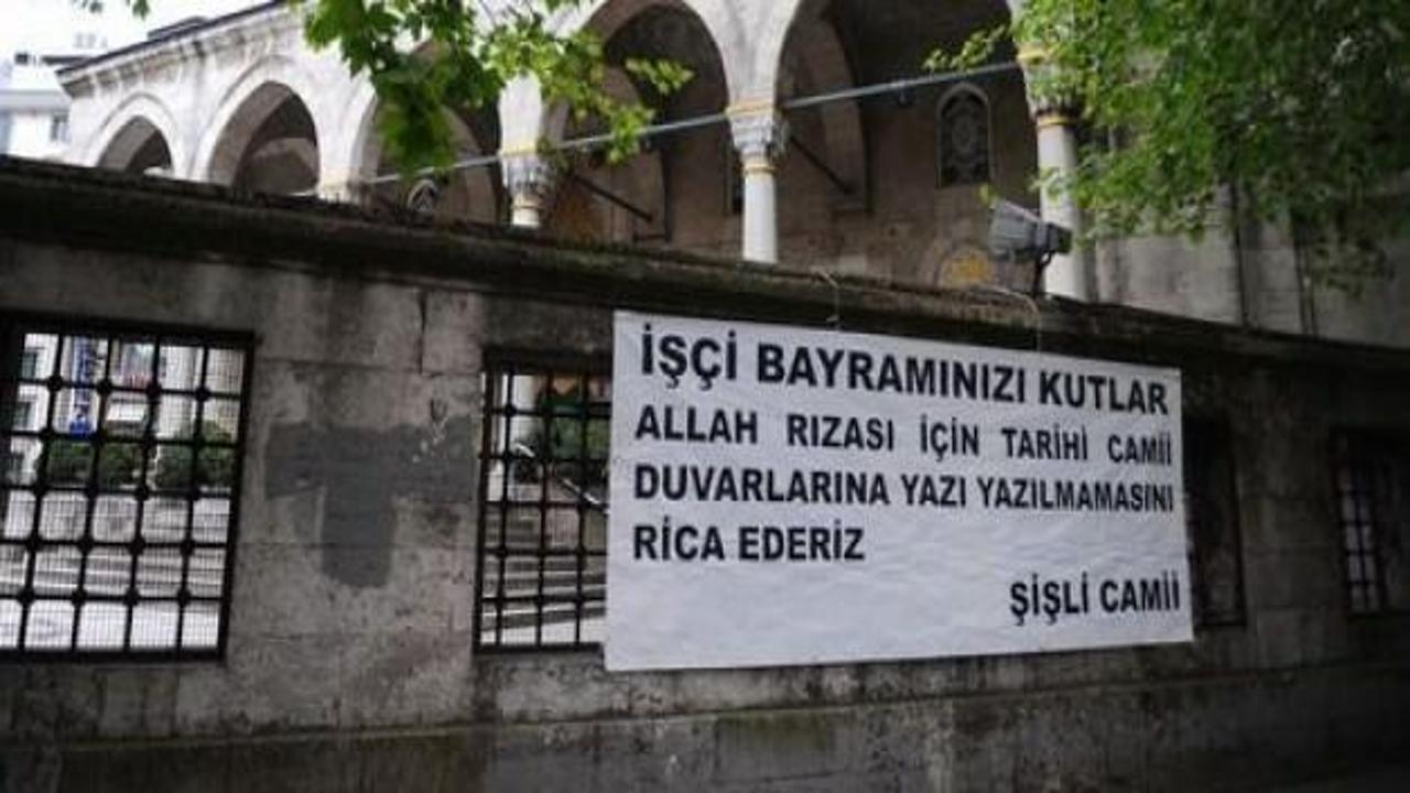Bu arada, Şişli Camii duvarına asılan bir pankart dikkat çekti. Pankartta, "İşçi bayramınızı kutlar, Allah rızası için tarihi cami duvarlarına yazı yazılmamasını rica ederiz. Şişli Camii" ifadeleri yer alıyor.