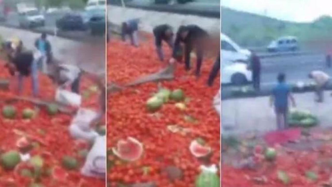 Kamyon devrildikten hemen sonra yoldan geçenler araçlarını durdurarak ellerinde dökülen domatesleri ve karpuzları toplamaya başladı.