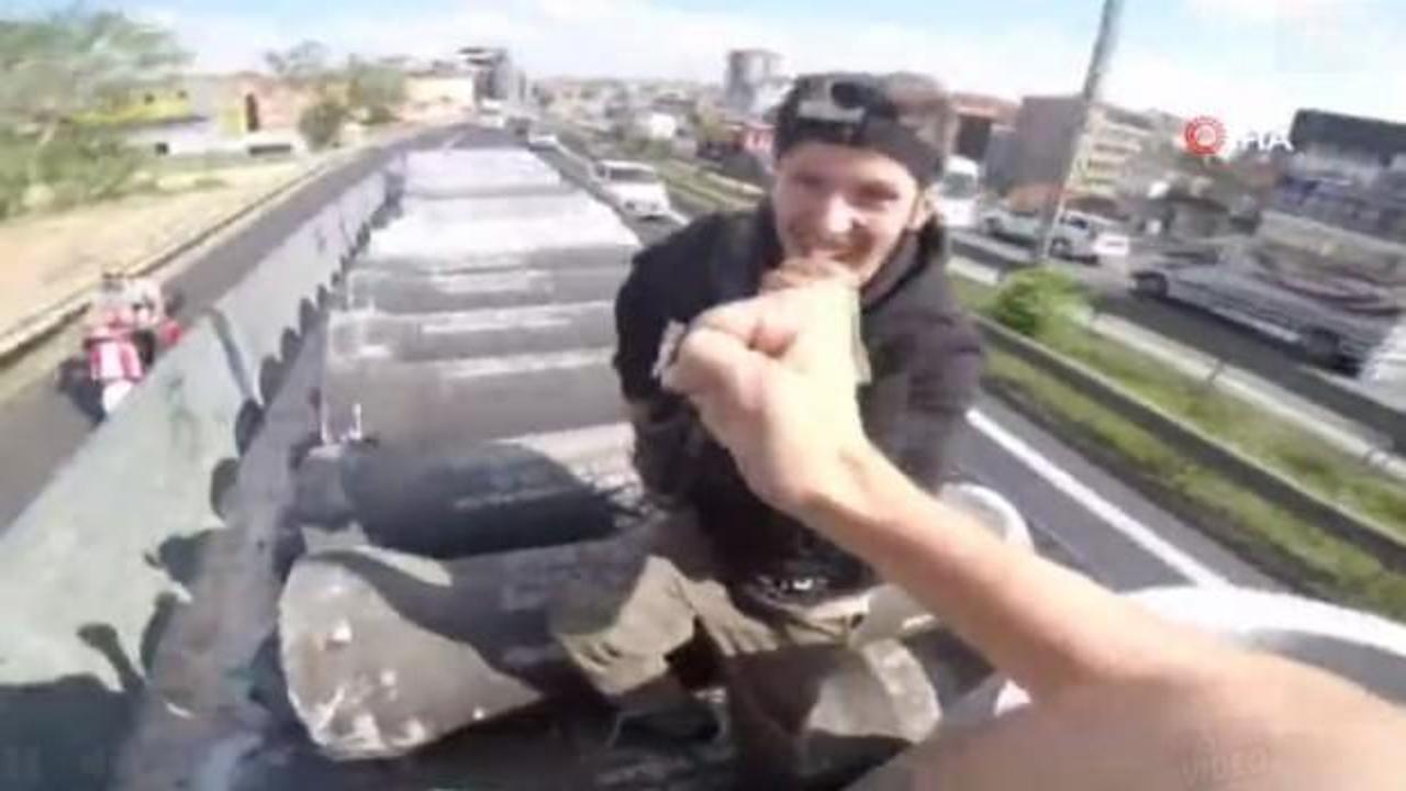 Daha önce Yavuz Sultan Selim Köprüsü'nün tepesine çıkarak çektikleri videoyla yürekleri ağıza getiren gençler, bu kez de hareket halindeki TIR'ın dorsesine atladı.