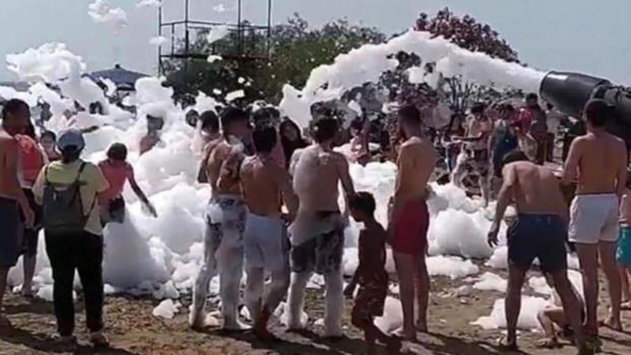 Bursa’daki Kumsaz sahilinde köpük partisi yapan tatilcilerin, sosyal mesafe ve maske kuralına uymadığı görüldü.