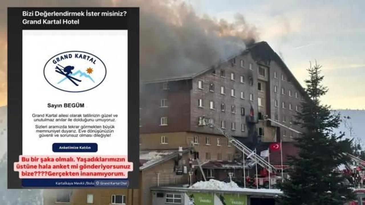 Bolu Kartalkaya'da 78 kişiye mezar olan Grand Kartal Otel'in müşterilerine gönderdiği değerlendirme paylaşımı tepki çekti.