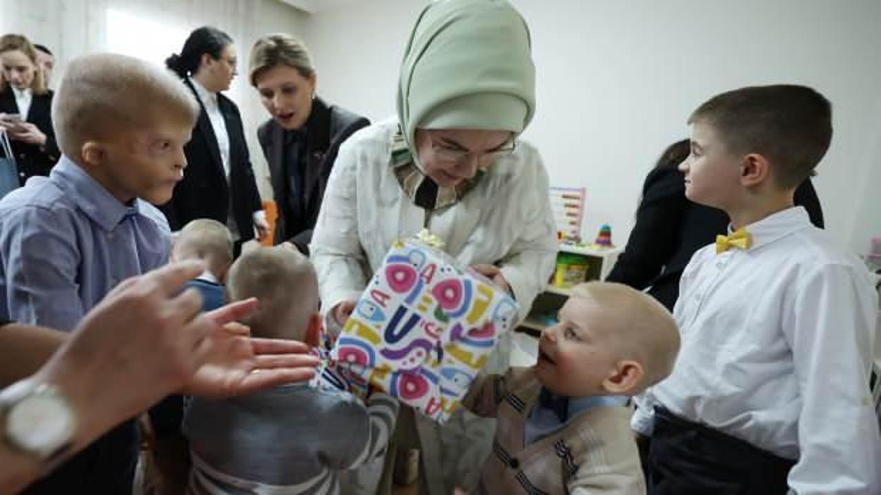 Emine Erdoğan ve Ukrayna Devlet Başkanı'nın eşi Olena Zelenska, Ankara'daki savaş mağduru çocukları Eryaman Çocuk Evleri Sitesinde ziyaret etti. Erdoğan ve Zelenska, yakından ilgilendikleri çocuklarla oyunlar oynadı, onlara masal okudu.