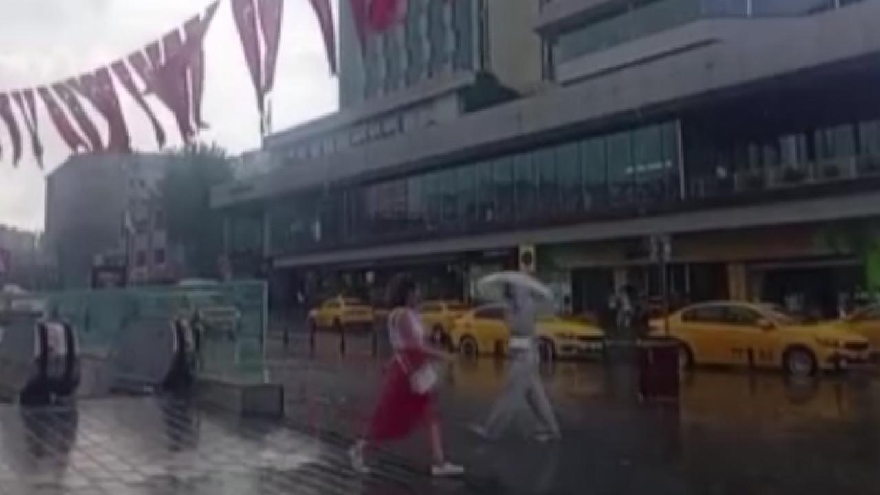 Taksim Meydanı’nda bir anda bastıran yağmur turist ve vatandaşlara zor anlar yaşattı.