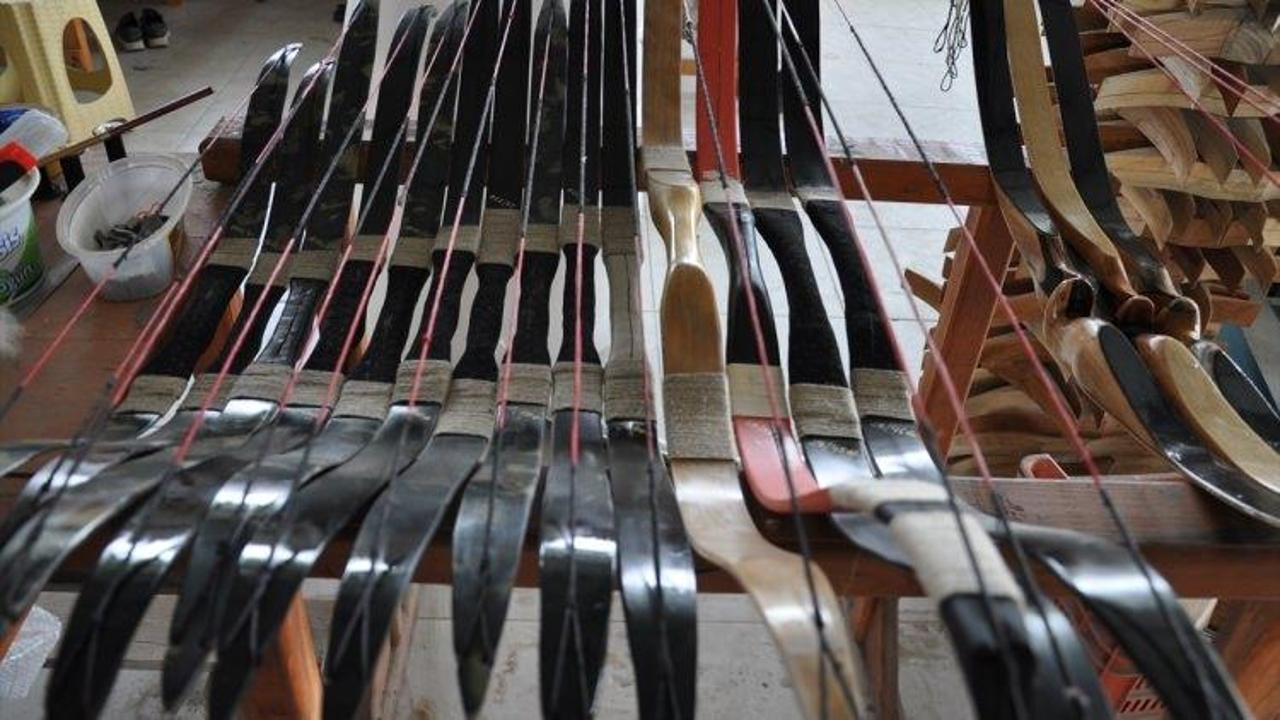 Erzin ilçesinde okçuluk sporuyla ilgilenen Vedat Peker, geleneksel ok ve yay ustalığını yaşatmak için açtığı atölyesinde 10 yıldır geleneksel ürün yapıyor.