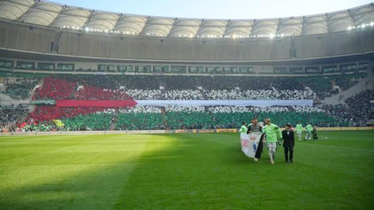 Bursaspor bugünkü maçta 41 bin 480 seyirci ile rekor serisini devam ettirdi. İsrail ile Hamas'ın ateşkes anlaşması yapması üzerine yeşil-beyazlı taraftarlar Gazze'de zulme uğrayan insanlar için kırmızı, beyaz ve yeşil renkte bayrak salladı. Stadyumdan da Özgür Filistin marşı çalındı.