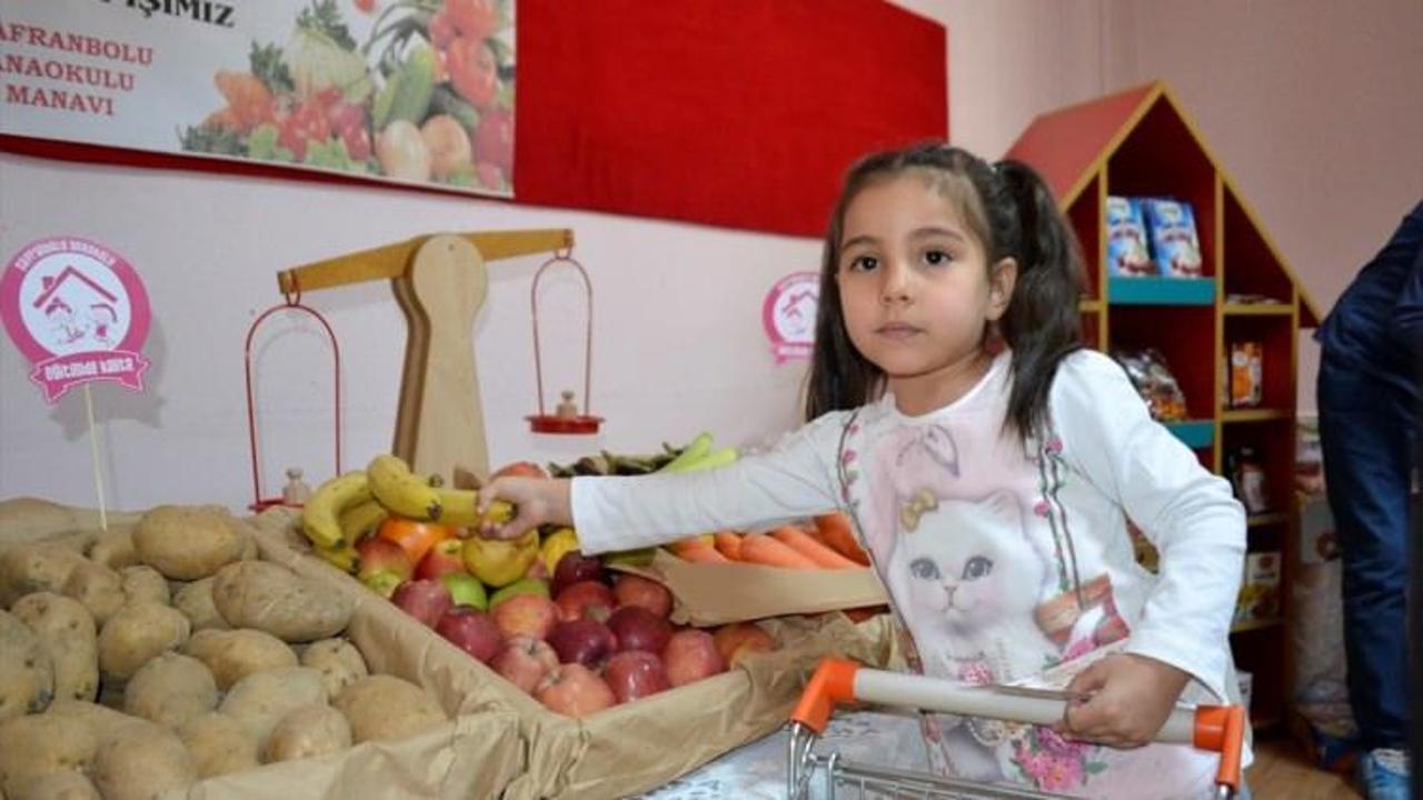 Safranbolu ilçesinde, 3-5 yaş anasınıfı öğrencileri, okulda kurulan marketten alışveriş yaparak vergi bilincini öğreniyor.