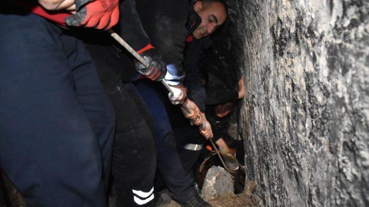İtfaiye, veteriner ekibi ile mahalle sakinlerince yapılan çalışma ile at, halata bağlanarak sıkıştığı yerden çıkartıldı.