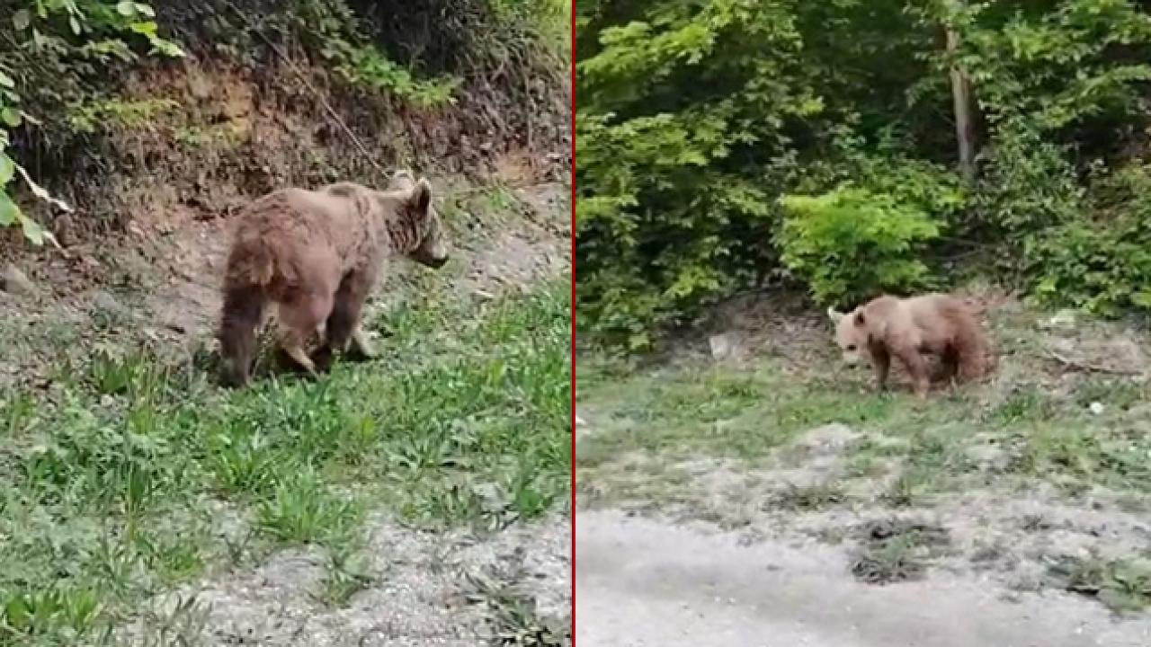 Küre ilçesinde Kastamonu-İnebolu karayolu kenarındaki bir ayıyı gören vatandaş o anları cep telefonuyla görüntüledi.