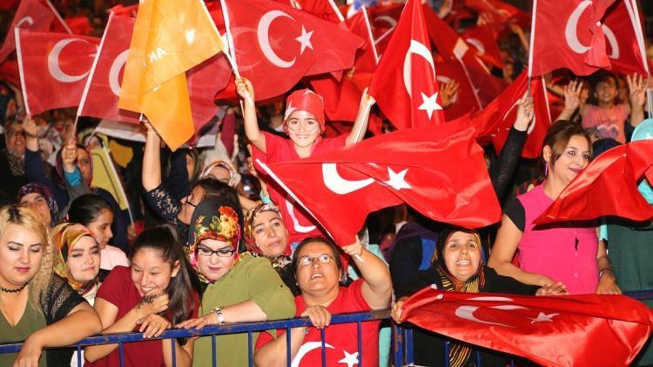 Ellerinde Türk bayraklarıyla meydanı dolduran binlerce kişi, "Darbeciler halka hesap verecek" sloganları attı, sık sık tekbir getirdi.