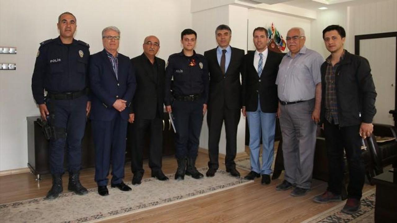 Kilis'te, Suriye'den tarafından atılan roket mermisinin bir camiye isabet edip patlaması sırasında yaralanan bir vatandaşın yarasına tişörtünü tampon yapan polis memuru ödüllendirildi.