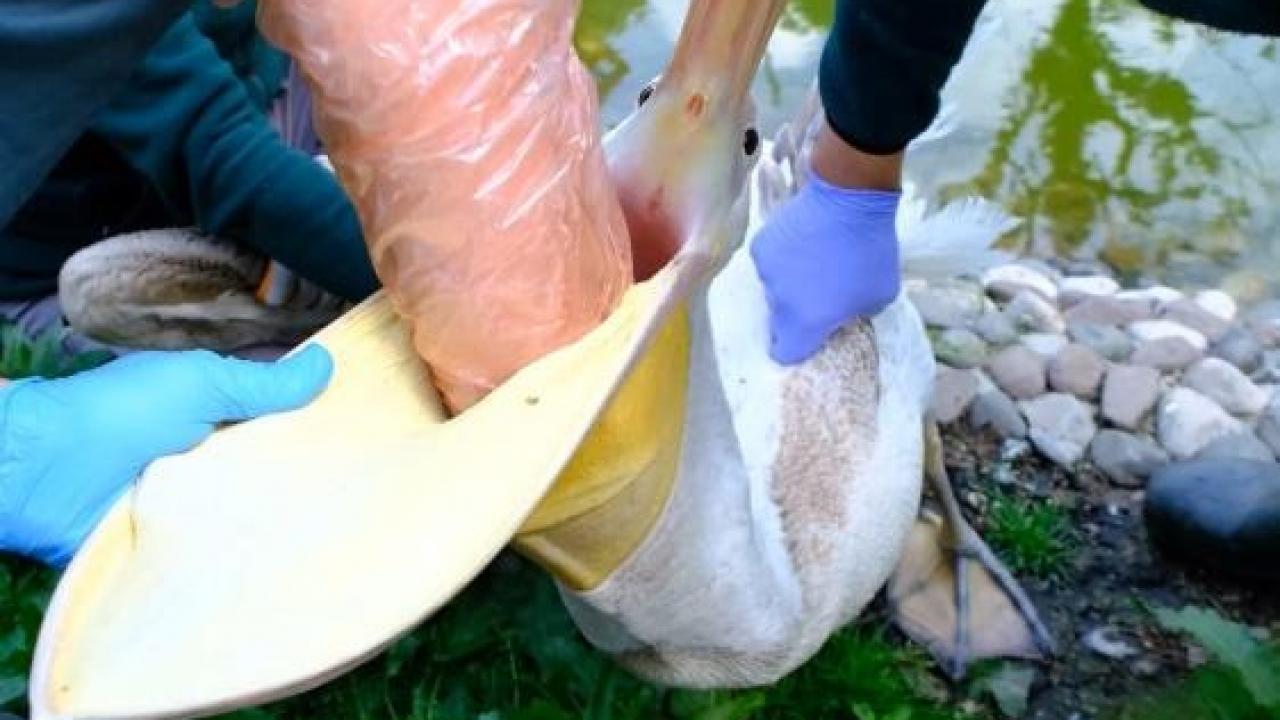 Kocaeli’de bulunan Avrupa’nın en büyük doğal yaşam parkı Ormanya’da bir pelikan, ziyaretçi tarafından atılan pet şişeyi yuttu.