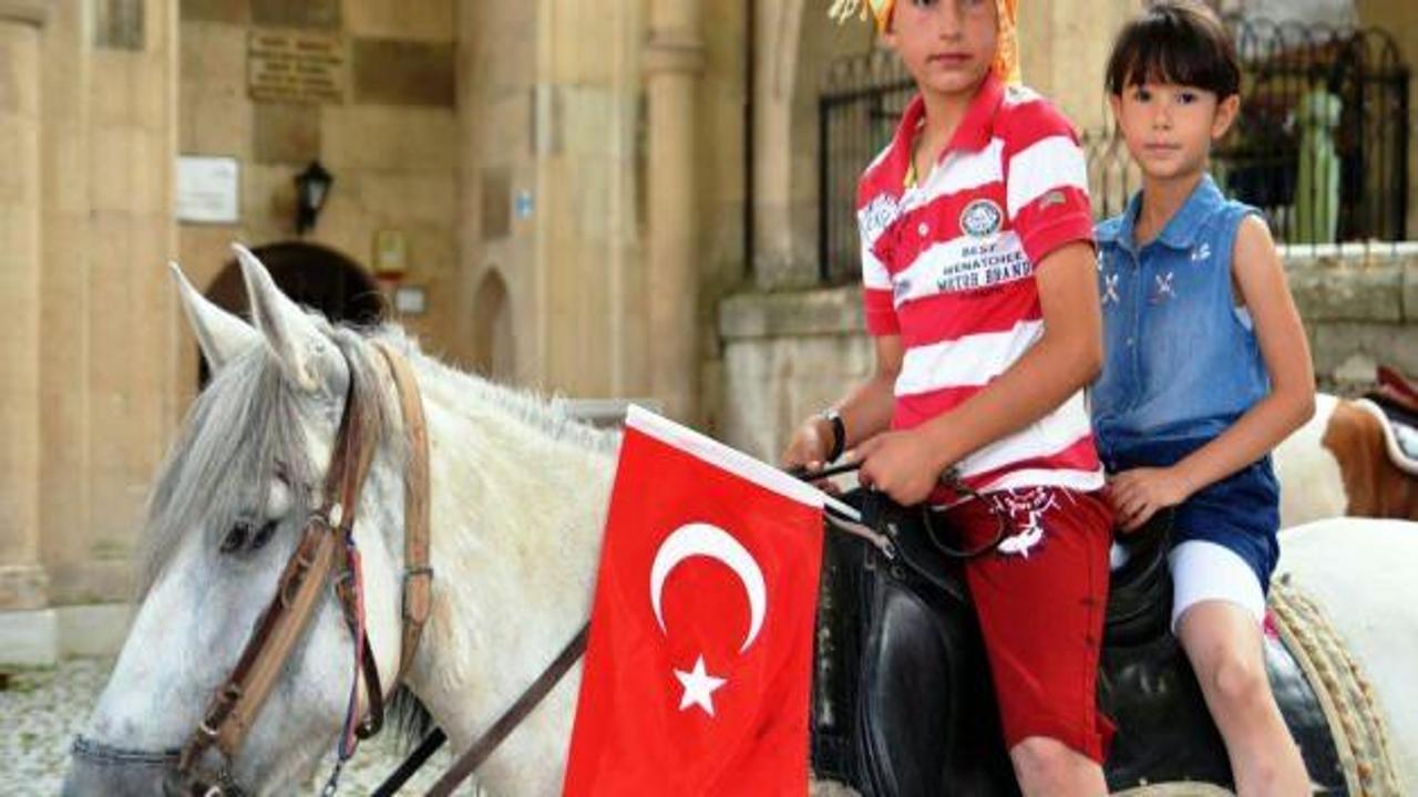 Börekçiler Mahallesi'ndeki Ulu Cami önünde atlarıyla toplanan grup, buradan sloganlar eşliğinde Atatürk Bulvarı'na ulaştı.